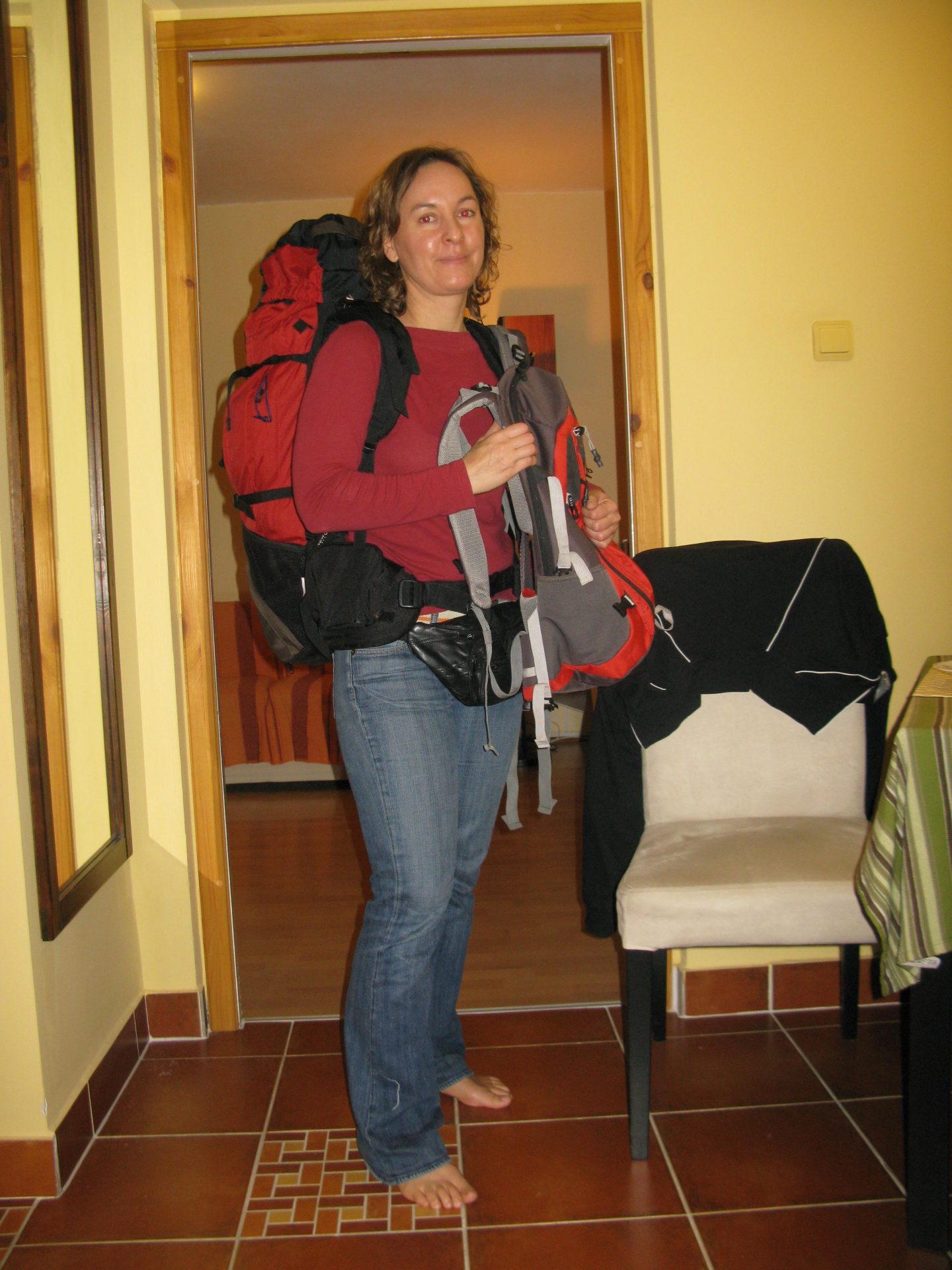 Pénteken csináltam egy próbapakolást, mert kezdett aggasztani a kupac mérete, ahogy gyarapodtott a holmi… és kiderült, aggodalmam nem volt alaptalan. Beletettem a bakancsot is a táskába mondván leginkább úgyis szandálban leszünk, nézzük meg mi lenne, ha épp buszozunk át egyik városból a másikba lenge kis nyári holmiban. A végén már erősen gyömöszölni kellett… megtelt a 60 literes zsák, és ebből a ruhám volt a legkevesebb. Jutott egy nagyon kevés a kishátizsákba is, bár valszeg ezek egyébként is odakerülnének. Persze van tiktos pénzes övtáskám és rendes övtáskám is. Tesóval kisebb harcot folytattunk a kishátiról, mert szerinte egy nagyon kicsi kellene csak, míg nekem fontosabb, hogy ki legyen párnázva a háta és elálljon, ne tapadjon rám teljesen. Megnéztem, a zsák önsúlya nem több.. csak nagyobb… szerintem az nem gond. Tesó szerint a kishátit beletesszük majd a nagyba… szerintem abba egy üres tesco-s zacskónál több nem férne bele… és szerintem nem is biztonságos, mert ha buszra szállunk, akkor én inkább fognám a kishátit benne vízzel, értékekkel… na de majd meglátja, mikor bepakol. Aztán volt egy király ötlete, hogy a gyógyszereket vegyük ki a dobozából és tegyük össze egy műanyagba… ezzel nyertünk némi helyet is. Na meg a samponból öntöttem át egy kisebbe és nagyon gyorsan lemondtam az arclemosóról is. Szappan lesz oszt jóvan. Majd a sósvíz mélytisztítja az arcbőrömet… a Mojito meg kisímitja a ráncaimat. 🙂