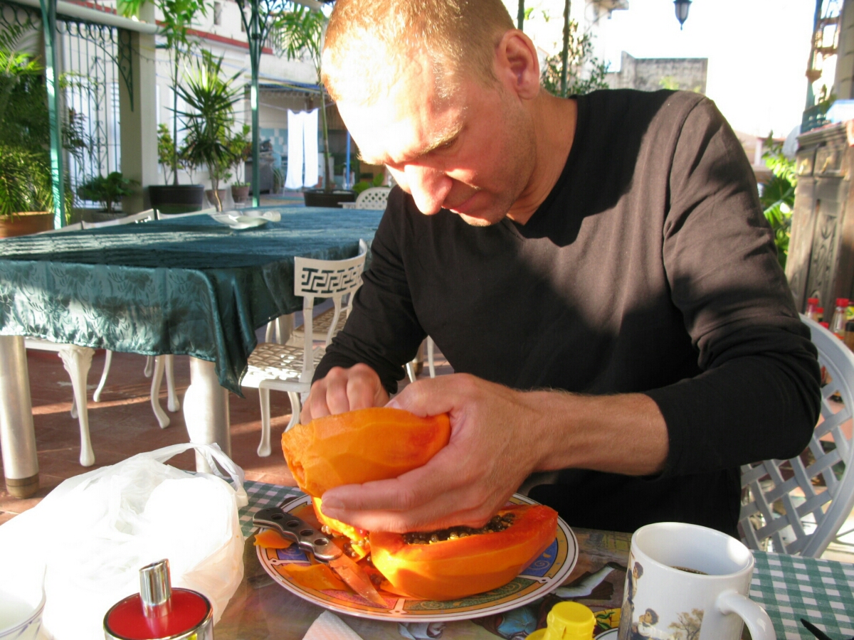 Korán reggel kimegyek a főtérre, hogy megnézzem nappal is Santa Clara-t, meg csinálhassak pár képet mielőtt indulunk Havannába. Útközben veszek reggelire egy papayát 10 pesóért, meg 2 zsömlét hozzá, megvan a reggelink is. A tetőteraszon kapunk teát, kávét, megesszük a papayát, nem is kell több. Jön a taxi 20 perc késéssel, de nem is baj, épp kész lettünk. Egy idős papa ül elöl, mellettünk egy jóképű, fiatal pakisztáni srác…. de rég hallottam már egy jó kis paki akcentust.. jót mosolygok magamban. A srác orvosnak tanul, amikor volt a nagy földrengés náluk Fidel felajánlott 1000 egyetemi helyet segítségnyújtás gyanánt. Ezzel a programmal érkezett a srác ide. Ingyen tanul, kap kaját, szállást, és amikor végez 3 évet kell ingyen dolgoznia valami elmaradott régióban. Hasonló a sztori, mint a Ghana-i srácnak még Havannából. A különbség annyi, hogy ez a srác kap a pakisztáni kormámytól havi 100 dollár ösztöndíjat, meg a család is megdobja havi 2-300-al, ami zsebpénznek itt nagyon sok pénz. Van is iPhone-ja, nem egy csóró srác. Mondja neki lehet internete, de a kubaiak csak a kubai belső intranethez férnek hozzá a netkávézókban. Azt is mondja, hogy a kubaiak nem vághatnak le egy marhát, mert az elsődleges funkciója a tehénnek, hogy tejet adjon… sok év börtön jár érte. Persze a turistáknak van a luxusszállókon, éttermekben. Beszélgettünk a rendszerről is, mondja, hogy sok fiatal szeretne fejlődni, ők rendszerellenesek, de a miniszterek nagyon öregek, nem látják be mi történik, nem akarnak változtatni, és mellesleg nekik minden luxusuk megvan az internettől kezdve az utazás, minden. Azt mondja amióta Raul van, azóta van némi lazulás, lehet saját kis üzleted, de nehéz követni a törvényeket, folyamatosan változik minden, nagyon zavaros. Emellett kifaggatott a mangánéletemről mintha ismerkedni akarna… és nagyon kedvesen felhívta a figyelmem, hogy 35 év felett már van némi kockázata a szülésnek… eszem a fiatal 25 éves orvostanhallgató fejét, úgy látszik az illemtan órán hiányzott, vagy csak más világból jött, ahol a nők ezzel lehet nincsenek tisztában, bár nem hiszem, hogy ezt ne tudná mindenki. 🙂 Elkérte az email címemet, apja azt akarja, hogy Londonba csinálja a szakosodást, van ott rokon is… megoldják majd biztos. Egyébként orvos az egész család, tesói is annak tanulnak. Megérkezünk Havannába, rég szívtam már ilyen sűrű szmogot… itt van a legtöbb régi autó, de az újak is füstölnek ezerrel, nem foglalkozik ezzel senki. Megérkezünk a buszállomásra, kiderül, hogy a hátizsákom derékkötőjére folyt egy kis benzin, tiszta benzin lesz a rövidgatyám, pólóm. Még szerencse, hogy az enyémre folyt, Tesó mekkora cirkuszt csinált volna nekem, így legalább nincs lehetősége sokat morogni… bár így is ? bosszankodik jobban. Busz kettőkor megy, elég volt a szakadt taxizásból, van két óránk enni valamit….. a papaya már rég volt. Igen ám, de elfogyott a jegy, jöjjünk vissza kettőre, és ha valaki nem jön el, akinek foglalása van, akkor lehet szerencsénk. Hát ez nem túl kecsegtet?… az év vége miatt sok a turista, és a helyiek is igyekeznek haza a családjukhoz, az év végét a családdal szokás ünnepelni. Kimegyünk, cápák megint, megalkudunk gyorsan egyre, 30 cuc-ért elvisznek kettőnket Vinales-be. Igen ám, de indulás azonnal… a kocsiban van már egy holland pár, ők 40-et fizetnek. Nem tudják, hogy kb. a busz árában elvisznek, nem szabad sokkal többet fizetni. Mi ketten elöl ülünk, régi nagy batárral megyünk. Felszedünk még 3 helyit… akkor még 3 óra autózás. Szerencsére mindig van nálunk egy csomag keksz… Tesó sokat tiltakozott miatta az elején, mondtam, hogy mindig kell kajának lennie nálunk, bármi történthet. Majd ha lehet müzliszeletet veszünk, de itt nem nagyon van más választásunk. Szóval egy csomag keksz az ebédünk, majd ha odaérünk, kajálunk. Persze az ember megállt a falujában, ami útba esett… mellesleg az autópályás lekanyarodás is sajátos volt: át a szembe sávba, onnan a szembe lehajtó sávon fel a kereszteződésig… hú bakker… nézünk keményen… de végül is ebbe a forgalomba belefér. Vissza is így jövünk… le szembe, át a másik oldalra. Pinar del Rio-ba kitesszük a helyieket, majd leint egy taxit, fizet valamennyit és átpaterol bennünket a másikba, majd az elvisz Vinales-be. Hát nem valami ügyfélbarát rendszer.. na de mindegy is… robogunk tovább.. még 20 perc és megérkeztünk. Szállásunk rendben van, kedvesen fogadnak minket, 25 cuc, ahogy még telefonon megegyeztünk. Az egész falu egy nagy üdülőhely.. csodás a táj… egy völgy, mellette kisebb hegyek… de olyan lekopott kúpoknak néznek ki.. nagyon szép. A házigazda kínálja a vacsorát, 7 cuc-ért f?z, mondjuk sok, keresünk a városban valamit. Mondja itt csak puccos étterem van… kérdezzük hol esznek a helyiek… itt csak drága hely van. Ráhagyjuk, elmegyünk szétnézni… mikor indulunk utánunk szól, hogy 5-ért csinálnak nekünk vacsorát, jó lesz-e. Elfogadjuk, homárt kapunk 5-ért, ami egyébként olcsóbb, mint a csirke. 🙂 A faluközpontban persze találunk 10 pesóért pizzát, meg egy helyet, ahol csinálnak olcsón reggelit… veszünk vizet meg 2 ananászt is.. nem lesz itt gond, majd beszerezzük mi a kaját magunknak… maradunk 5 napot.. ránk fér némi pihenés. Szép a táj.. majd túrázunk. Kell a mozgás, sokat ültünk manapság. Este kapunk egy kis rumot vacsora előtt. A kaja nagyon durván nagy adag… leves (hanyagolható), homár, rizs, feketebab, sült zöld banán, chips, sült valami krumpliféle… de annál édesebb… sok-sok saláta, és egy tál gyümölcs. Hát a homáron kívül a többin alig látszik, hogy ettünk belőle. Holnapra meg kellene egyezni