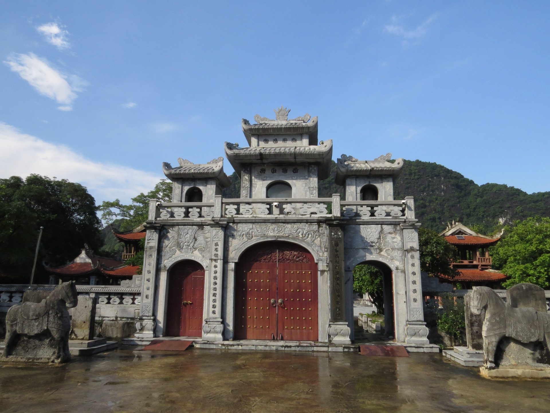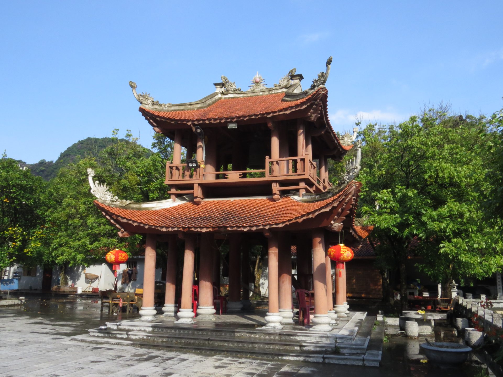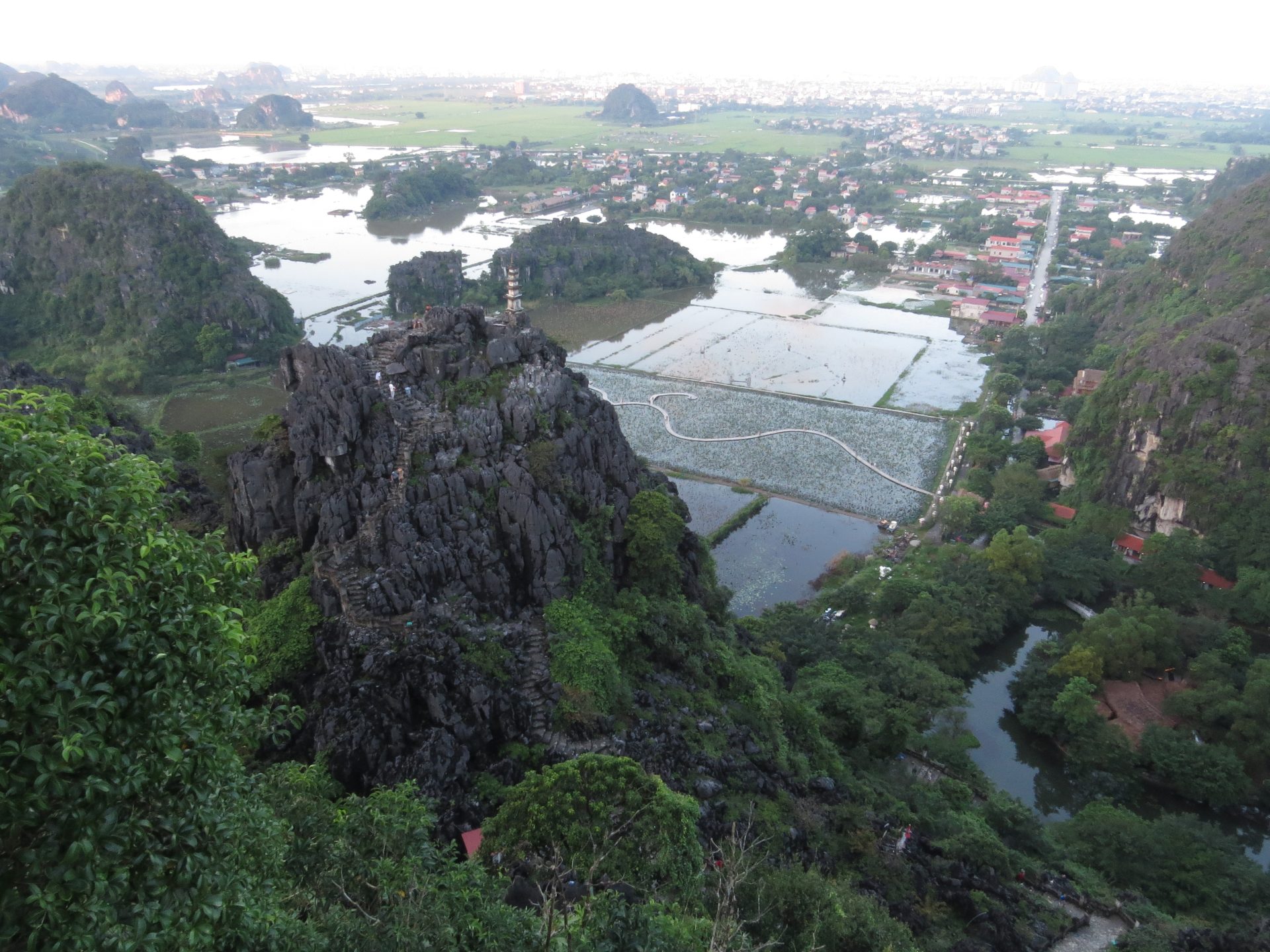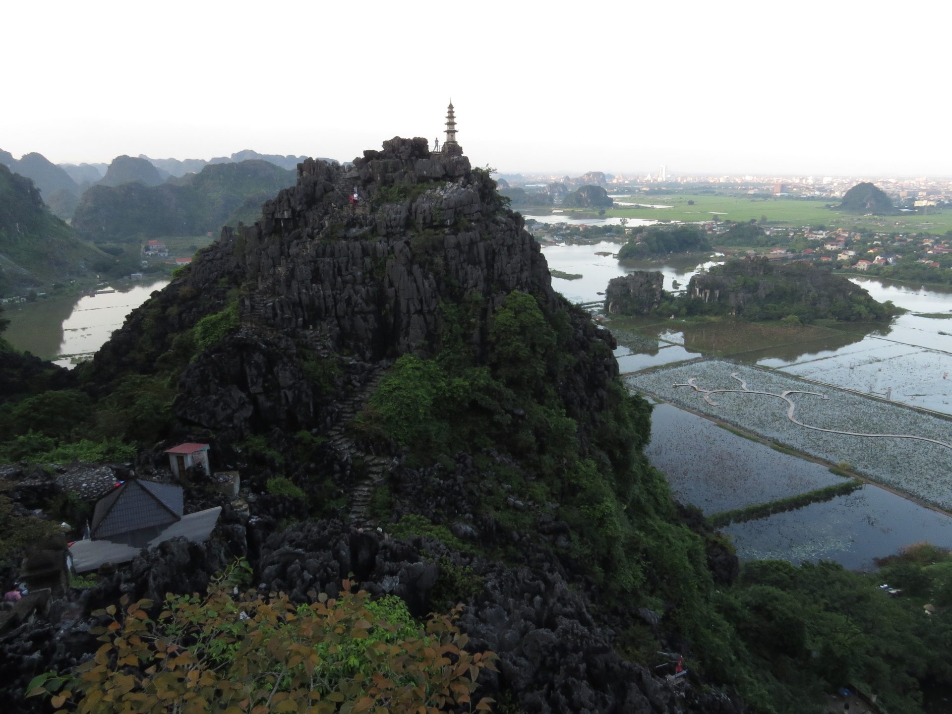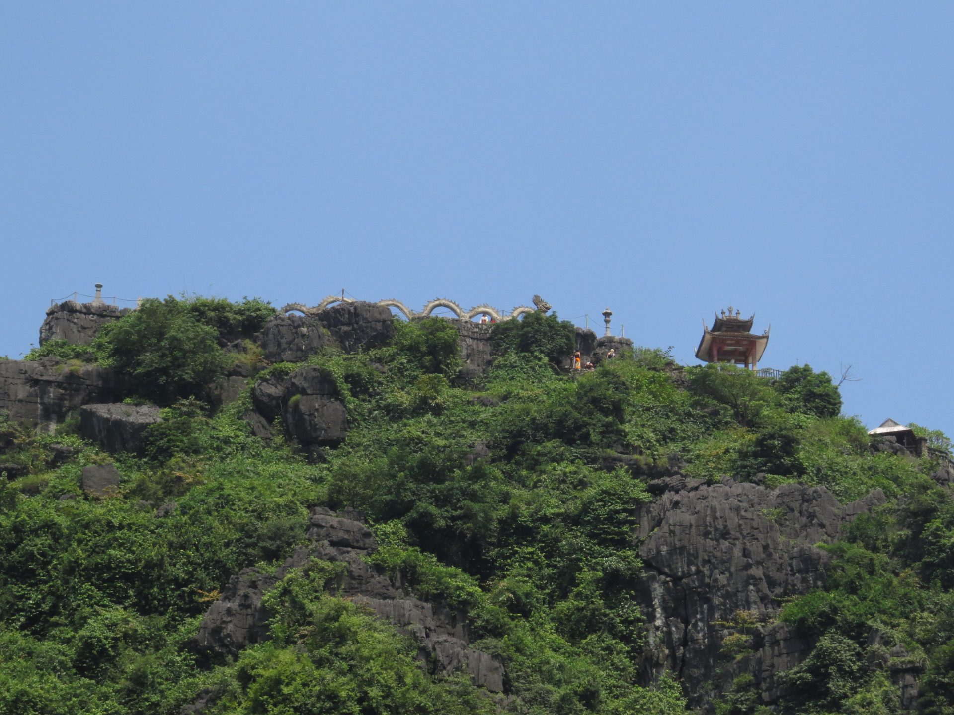 Persze ahogy kisütött a Nap az iszonyatos pára is jött vele. 15 perc vissza a motorhoz. El is döntöm, hogy csak semmi felesleges séta, ahová lehet, megyek motorral, főleg, ha ilyen sokmindet akarok megnézni, és közben az ég is leszakad. Akkor pattanok a motorra és irány Hang Mua, a hegytető a sárkánnyal, meg az 500 db lépcsővel. Útközben valaki mutatja, integet másik motorról nekem az utat, hogy ne arra menjek, amerre tervezte a Google. Lehet, hogy lett egy villámárvíz, a pagodát is eldöntötte a víz. De egyébként nem tudom miért terelt ki a főútra, de hiszek neki. 2 perccel hosszabb. Akkor főúton megint volt egy gyorsforgalmi úton szembe menés, mert elmentem a lehajtó mellett. Hát senki sem akadt ki. Nagyon rövid volt csak. Megérkezem, parkolás 15k. A legdrágább az eddigi úton. Eddig 10k-nál nem volt több. Aztán a barlang még 80k. Drága egy nap ez a mai… de egyébként ezen el sem gondolkodtam. Kell és kész.