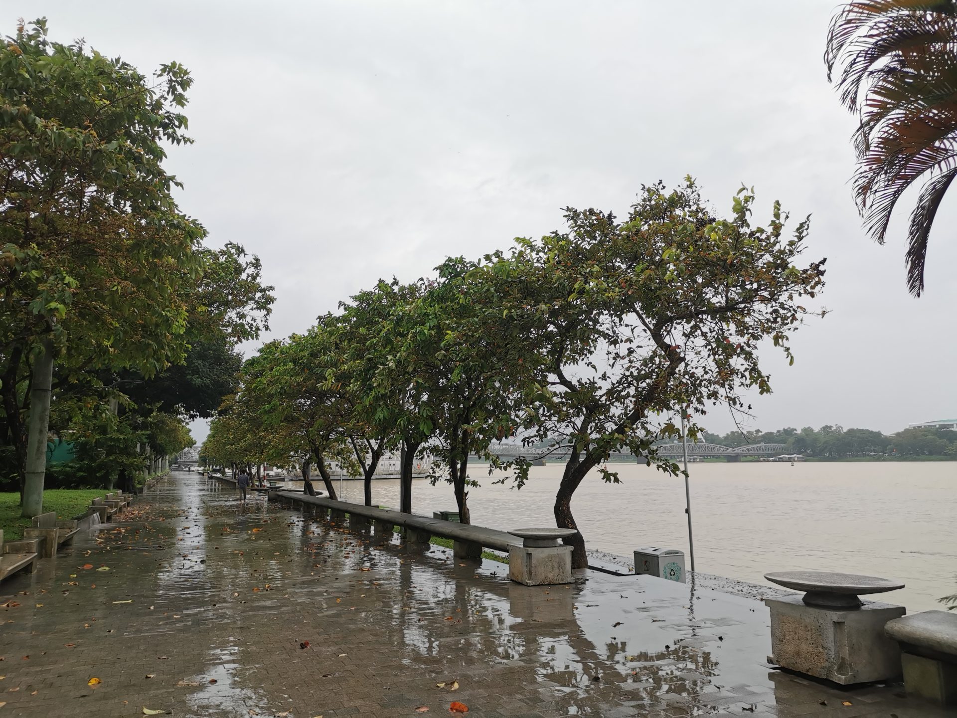 Persze szandi, rövidnadrág a szerkó. Ha esik, jobb, ha nincs rajtad sok ruha szarrá ázni. Az ember lába hamarabb megszárad. Nem véletlenül megy mindenki papucsban, rövidnadrágban, meg esőkabátban. Átmegyünk egy hatalmas hídon, ami a Han-folyó torkolatánál van. Nagyon látványos, ahogy a földtől sárga folyó keveredik a messzebbi kék tengerrel. A végtelen víz, nagyon szép. Fotó nincs róla, mert a híd nem túl magas, így a fotón csak egy vékony sáv lenne, fentről lenne látványos ezt fotózni.